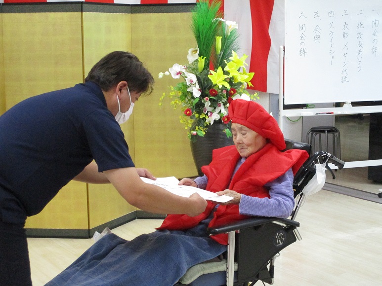 私から米寿を迎えた入居者様へ御祝状をお手渡し