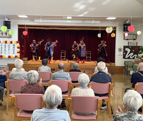 ご利用者様方は、スコップ三味線の響きに合わせ、身体を揺らしたり手拍子をしたりするなど楽しんでおられました。