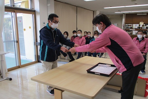 30年勤続の介護支援専門員 兼 介護職主任1名と20年勤続の生活相談員 兼 業務管理係長1名の両名をはじめ、10年勤続の介護職など10名 計12名の功績を讃えました。