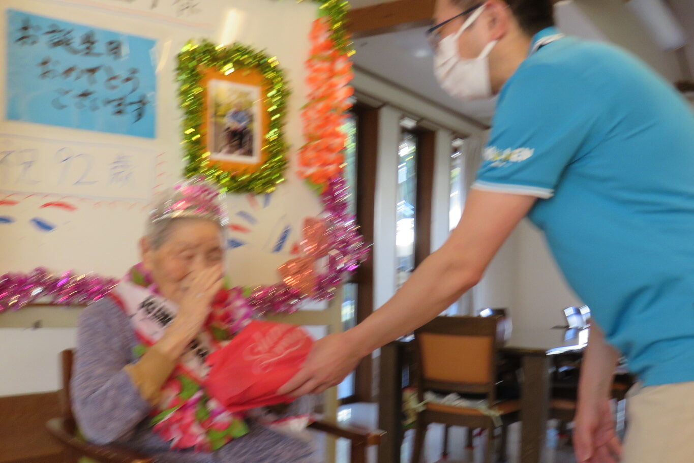ボードの前で記念撮影、そして誕生日プレゼントをお手渡しさせていただきました(●´ω`●)(少しブレています。すみません)